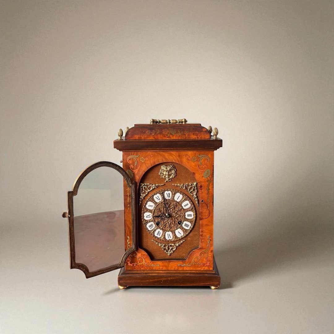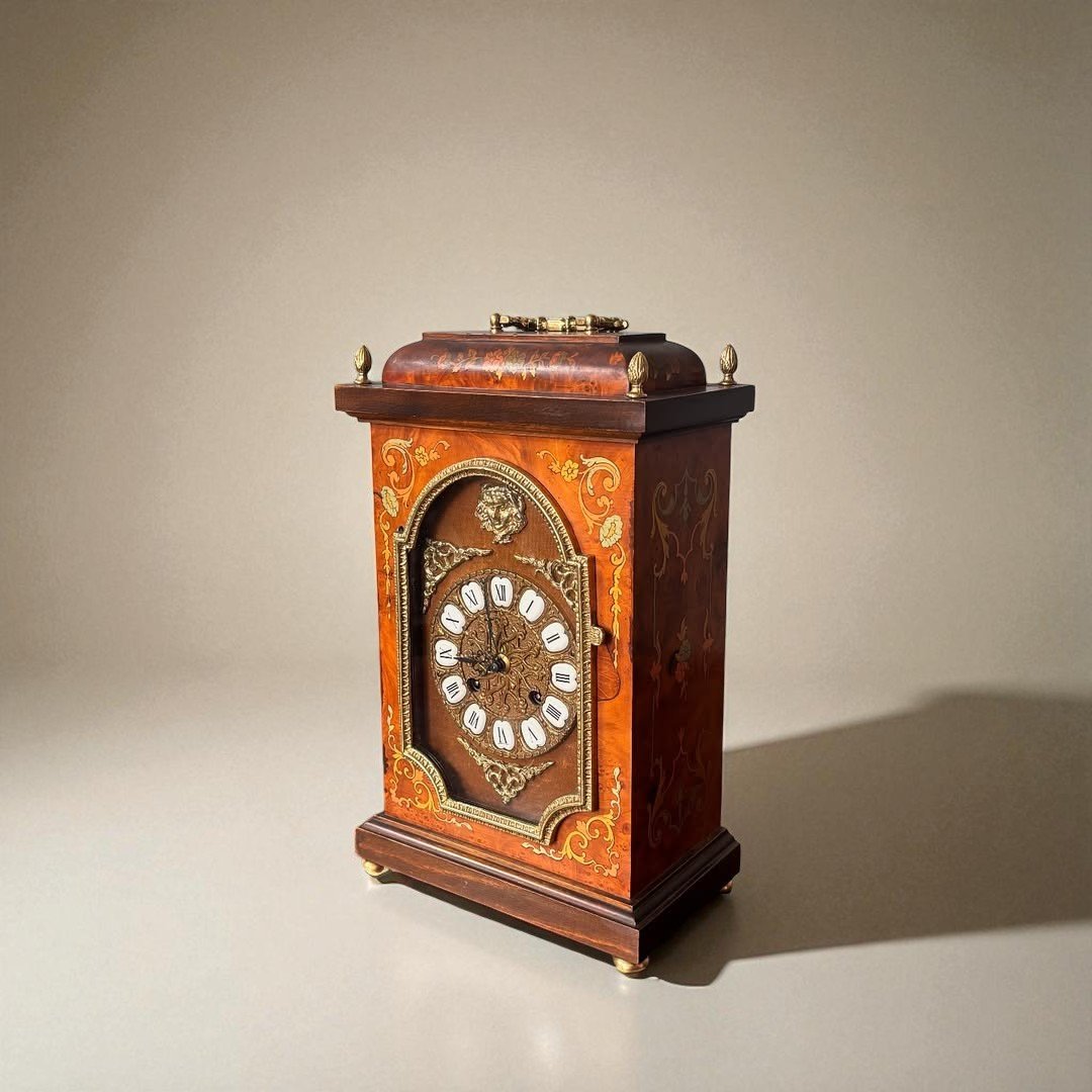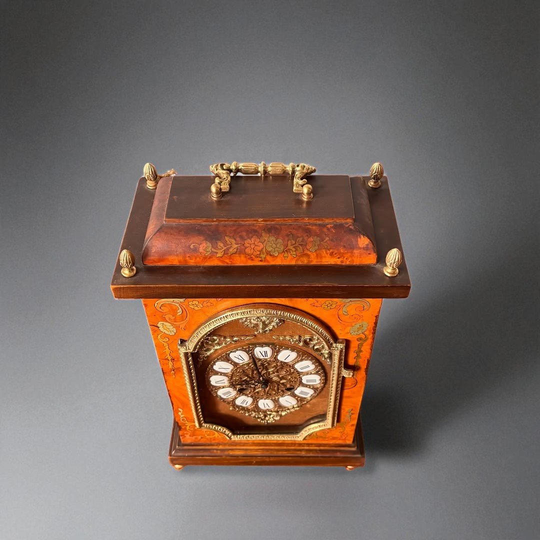 A late 19th-century to early 20th- century German bracket clock, The clock features a rectangular wooden case crafted from finely figured burr walnut, visible on the front, back, and sides. The top is slightly domed with a central cast brass urn finial and matching smaller finials at the four corners of the flat section.